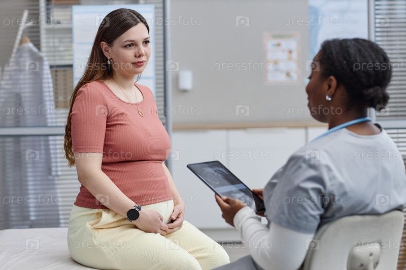 Беременная молодая белая женщина консультирует чернокожего врача в клинике