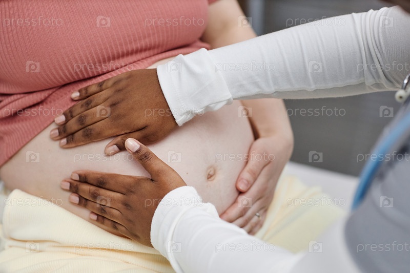 Белокожая беременная женщина получает пренатальный осмотр у чернокожей женщины-врача