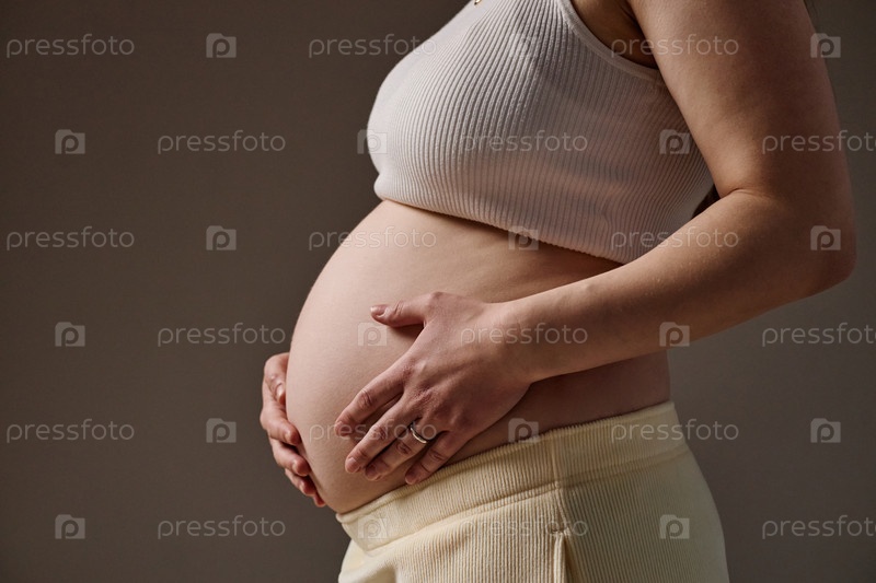 Кавказская молодая взрослая женщина ложится на беременный живот в нейтральной студии Ca