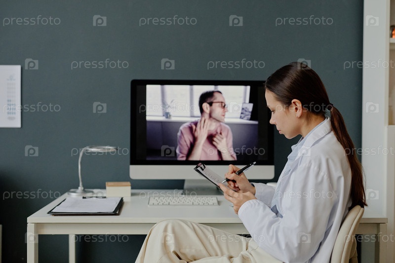 Женщина молодой взрослый дерматолог консультирует белого мужчину по видеозвонку