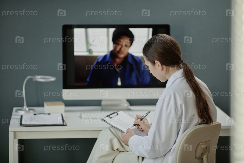 Кавказская женщина-врач консультирует молодую чернокожую женщину среднего возраста онлайн
