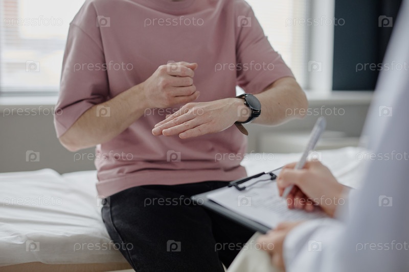 Молодой белый мужчина описывает состояние кожи во время консультации у дерматолога