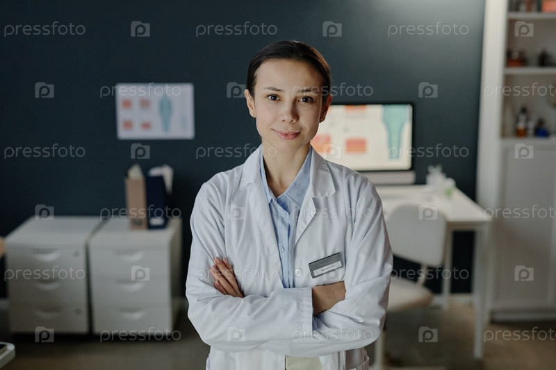 Портрет молодой взрослой белокожей женщины-дерматолога, стоящей уверенно