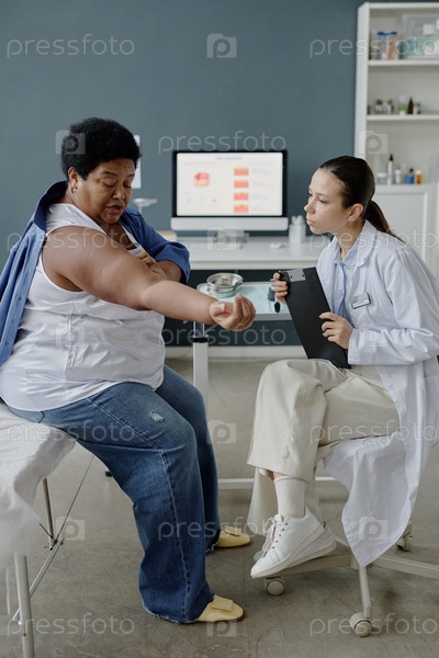 Вертикаль старшей чернокожей женщины, показывающей кожу молодому взрослому белому врачу