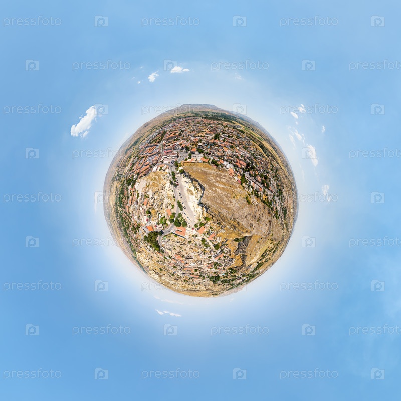 Ургуп, Невшехир, Турция. небольшая планета с воздушного изображения захватывает контраст между древними пещерными жилищами, современными отелями и обширной местностью Каппадокии. 360-градусный панорамный астероид