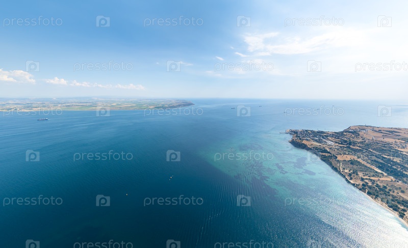 Панорамный взгляд из воздуха на Дарданелльский пролив с кораблями, залив Эртугрула, крепость Седулбахир, французское кладбище и Кумкале на противоположном берегу