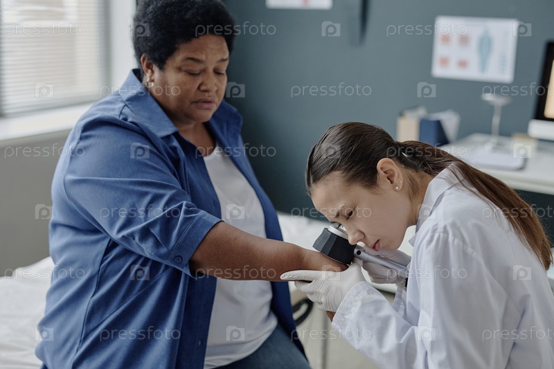 Чернокожая женщина среднего возраста проходит дерматологическое исследование кожи у врача