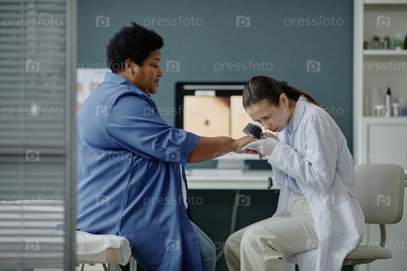 Молодая кавказская женщина-дерматолог изучает руку чернокожей женщины среднего возраста