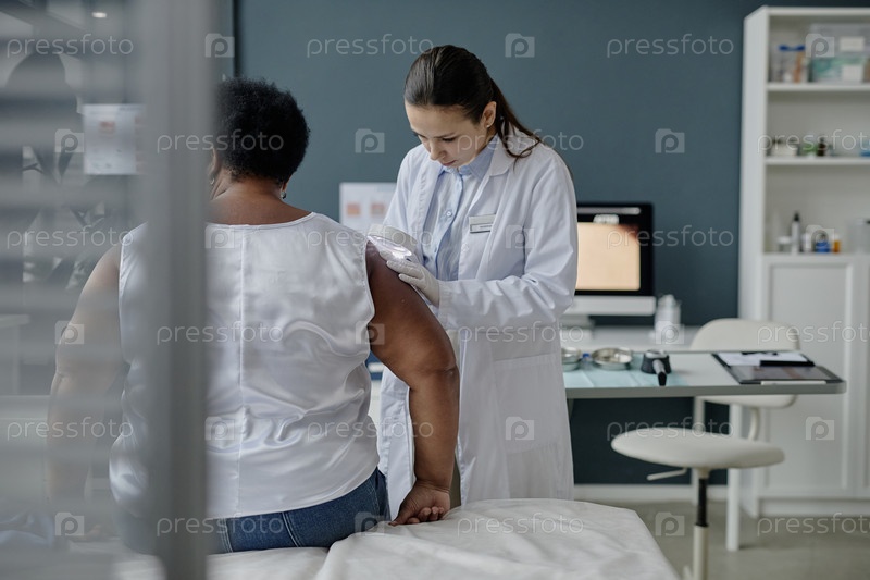Чернокожая женщина среднего возраста проходит дерматологическое обследование у врача-женщины