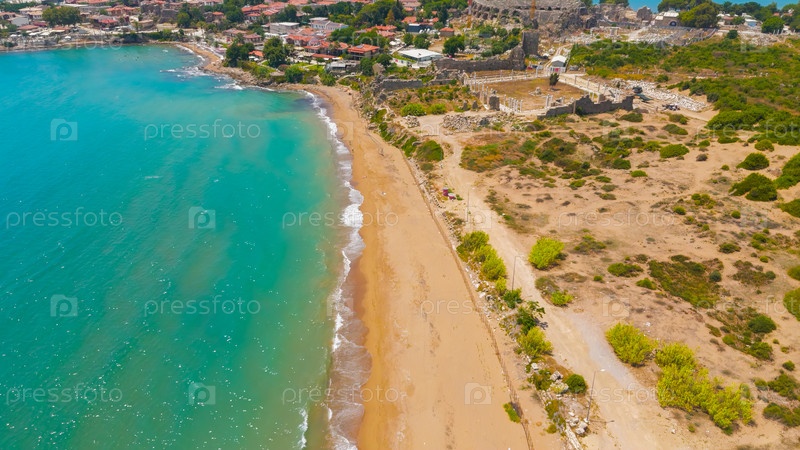 Старинная агора и римский амфитеатр с краном, храм Тихея, колоннадная улица, пляж на археологическом участке в солнечный день