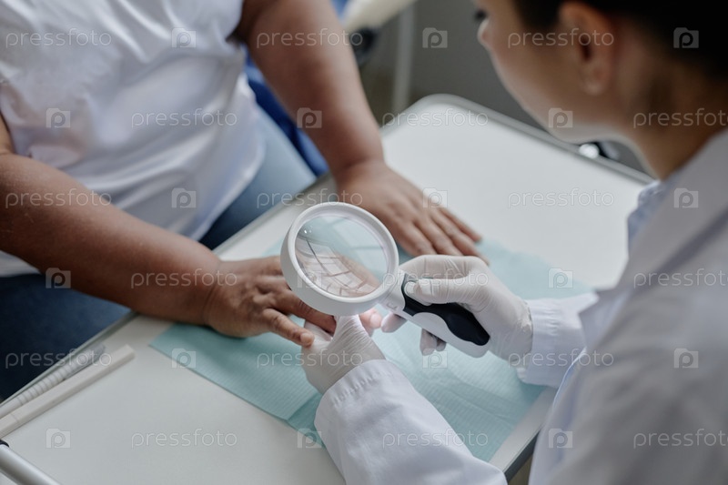 Кавказская женщина-дерматолог изучает руку чернокожей женщины среднего возраста