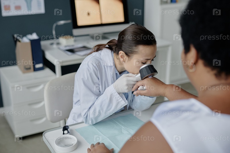 Молодая азиатская женщина-дерматолог осматривает руку чернокожей женщины среднего возраста