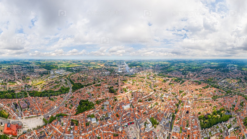 Брюгге, Бельгия. Центр города и его окрестности. Жилые и промышленные районы. Панорама на город. Летний день, облачная погода. Вид с воздуха
