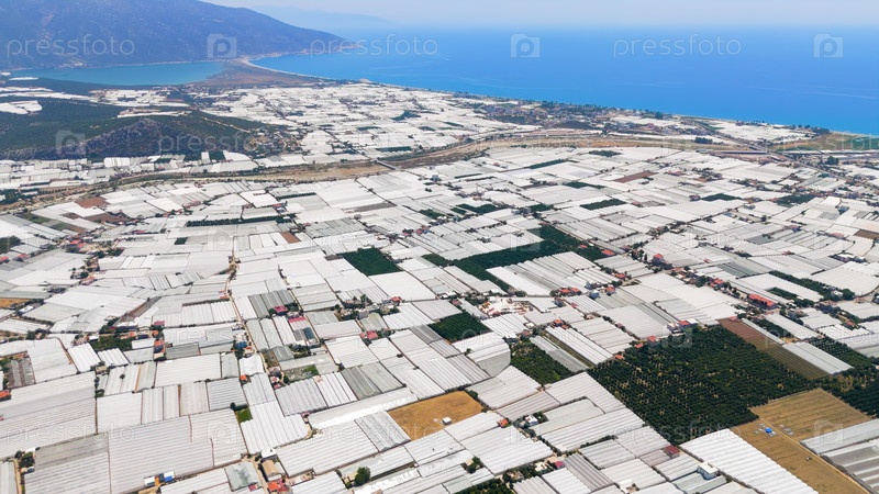 Вид с воздуха бесконечных белых парниковых полей возле берега Средиземного моря, современный город на заднем плане, летний пейзаж