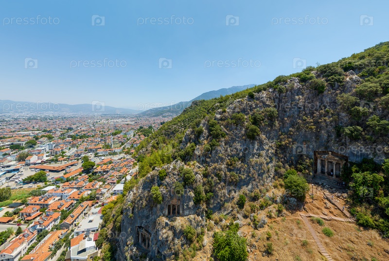 Панорама с воздуха, сосредоточенная на ликийских каменных гробницах в скалах с современным городом на заднем плане, культурное наследие