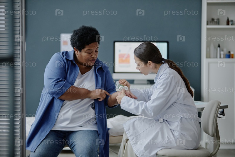 Старшая чернокожая женщина наносит лосьон во время дерматологического обследования