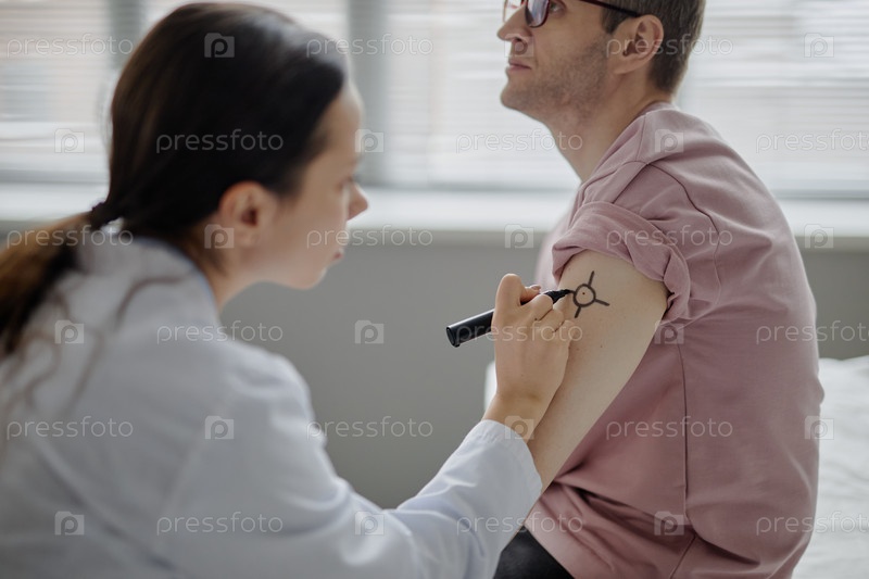 Кавказский молодой взрослый мужчина получает картографирование родинки от женского дерматолога