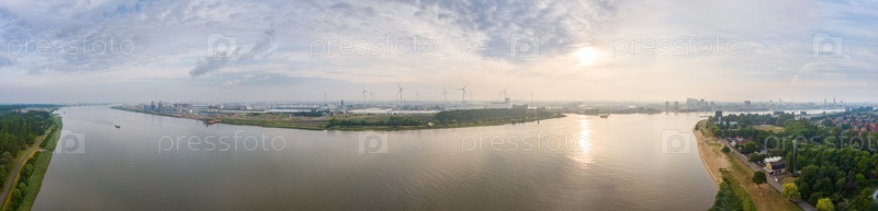 Антверпен, Бельгия. Панорама города. Река Шелда (Эскаут). Летнее утро. Промышленный район. Вид с воздуха