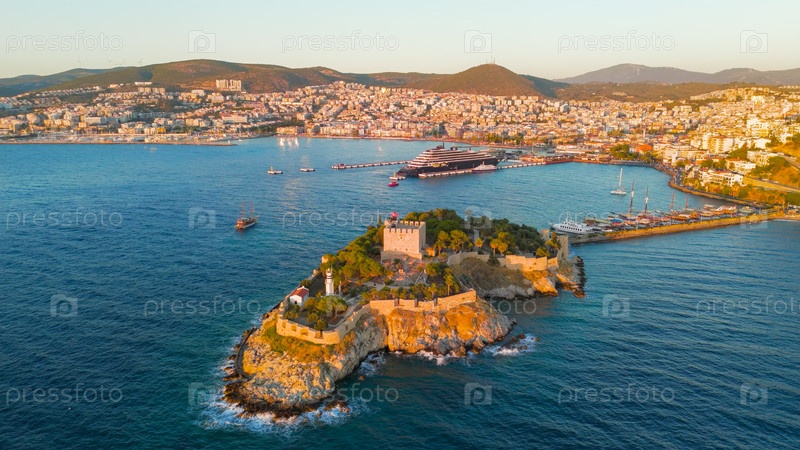 Кусадаси, Турция.Взгляд с воздуха на историческую крепость острова Голубей при закате солнца.На снимке запечатлен Пиратский замок, построенный Барбароссой, светящийся в вечернем свете