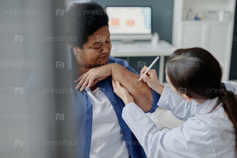 Чернокожая женщина среднего возраста получает оценку поражения кожи от врача-женщины