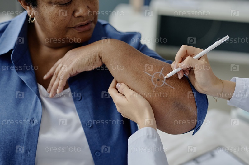 Чернокожая женщина среднего возраста проходит дерматологическое обследование у специалиста