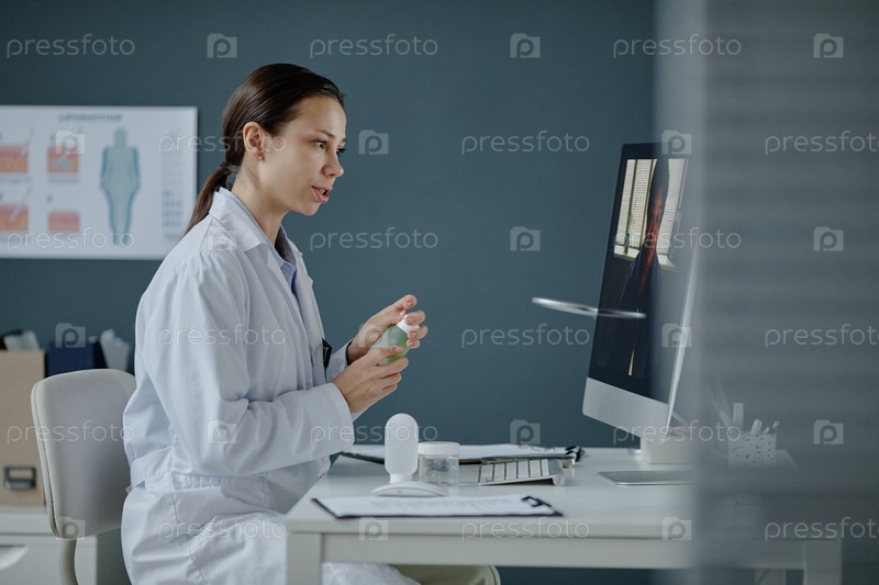 Девушка-дерматолог объясняет уход за кожей во время телемедицинской консультации
