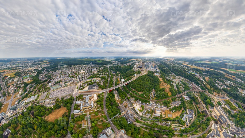 Люксембургский город, Люксембург. Панорама города. Летний день, облачная погода. Вид с воздуха