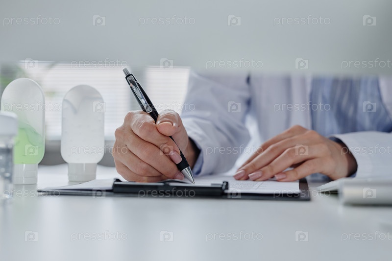 Кавказская женщина-дерматолог пишет медицинские заметки во время консультации с пациентом