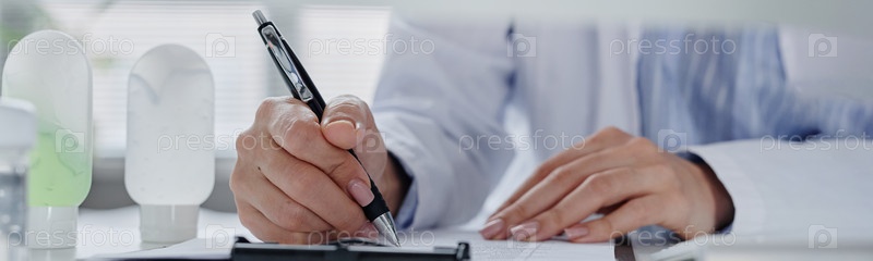 Header of Caucasian Woman Writing Medical Notes during Dermatology Consultation Заголовок белокожей женщины, пишущей медицинские заметки во время консультации по дерматологии