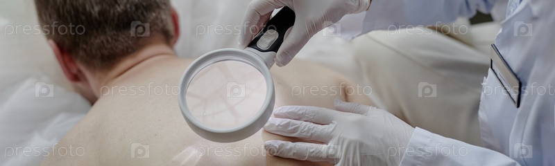 Заголовок взрослого мужчины, получающего оценку спинной кожи с помощью лупы
