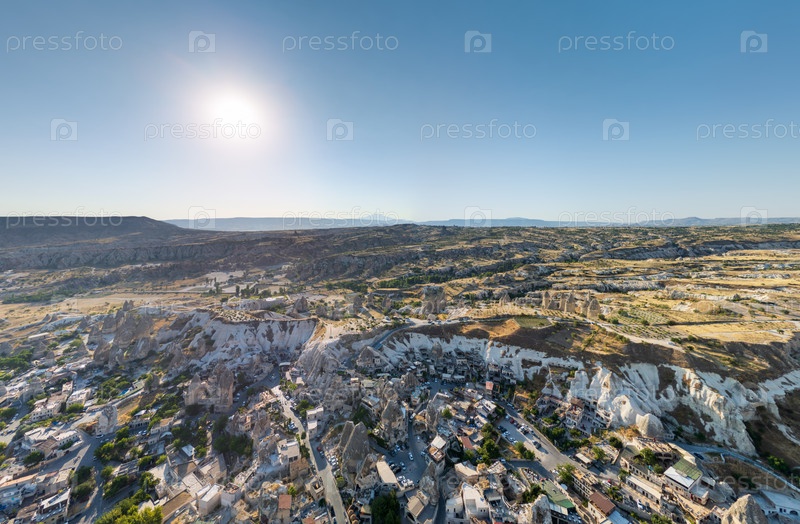 Широкий панорамный взгляд из воздуха на город Гореме, расположенный среди вулканических склонов и эродированной местности под солнечным утренним небом