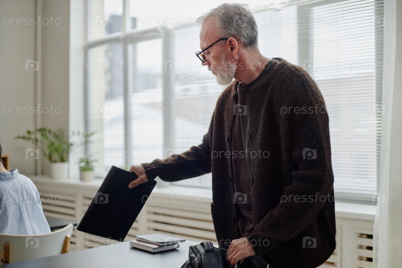 Старший белый мужчина с ноутбуком готовится к уроку в классе