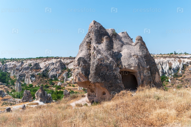 Потрясающая эрозионная скальная формация с естественной аркой и дверным отверстием, сухой травой на переднем плане, похожими образованиями на заднем фоне, ясное голубое небо
