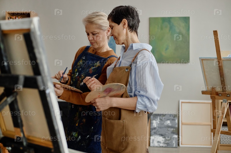 Кавказские женщины среднего возраста обсуждают технику живописи во время урока искусства