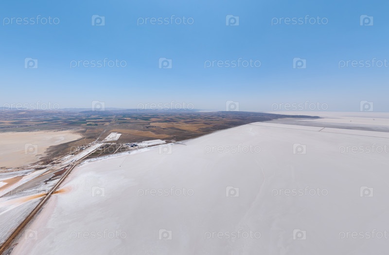 Расширенный взгляд с воздуха на соляные работы Туз-Голоу с бассейнами кристаллизации, инфраструктурой обработки и отложениями белой соли под интенсивным летним солнечным светом