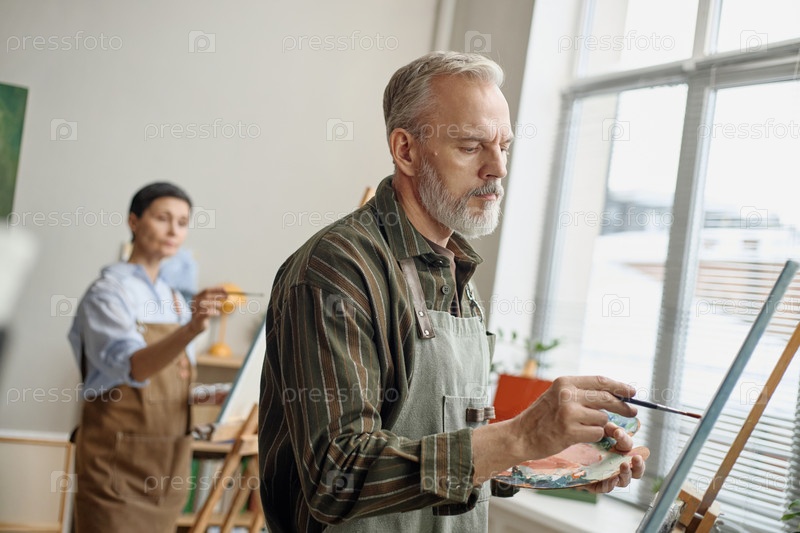 Кавказский мужчина среднего возраста рисует на холсте Обучение в групповом классе искусства
