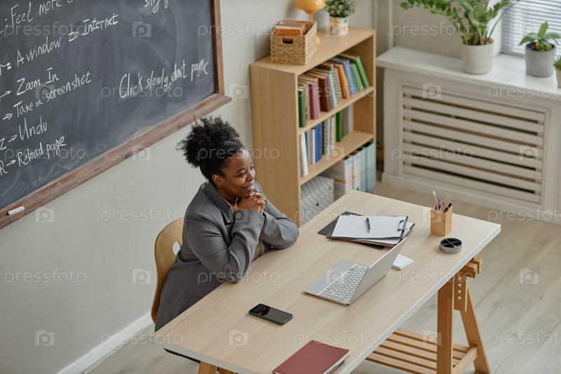 Молодая чернокожая женщина преподает класс компьютерной грамотности с использованием ноутбука в классе