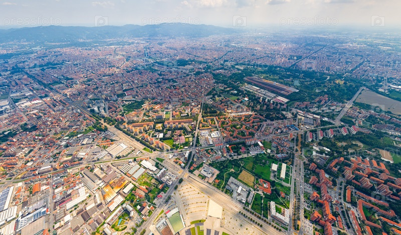 Турин, Италия Панорама города летом Промышленные и жилые районы Поля. Вид с воздуха