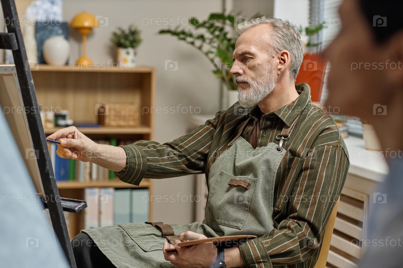 Кавказский мужчина средних лет рисует кистью в художественной мастерской
