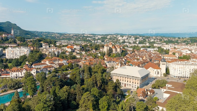 Аннеси, Франция. Замок Аннеси. Исторический центр города с рекой Тиу. Аннеси - город в Альпах на юго-востоке Франции, Aerial View