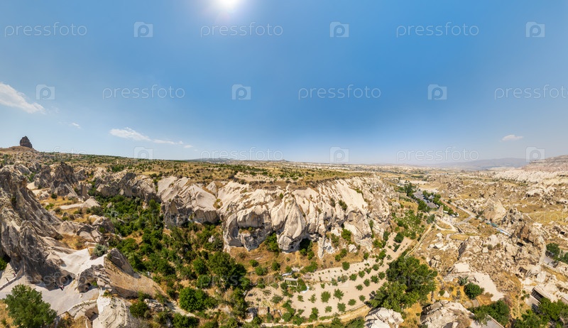 Гореме, Невшехир, Турция.Взгляд с воздуха на долину Горэма, демонстрирующую высокие волшебные дымоходы, вулканические туфовые образования и эрозированный ландшафт худу в Каппадокии