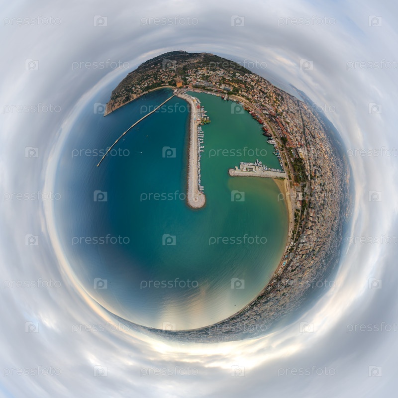 Маленькая планета стереографическая проекция непосредственно над маяком Аланьи, показывающая марину с яхтами, полуостров крепости, пляжи под небом. 360-градусный панорамный астероид