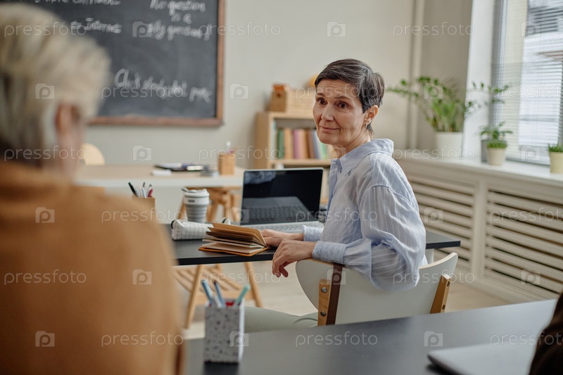 Кавказская взрослая учащаяся женщина разговаривает со своим одноклассником за столом в классе