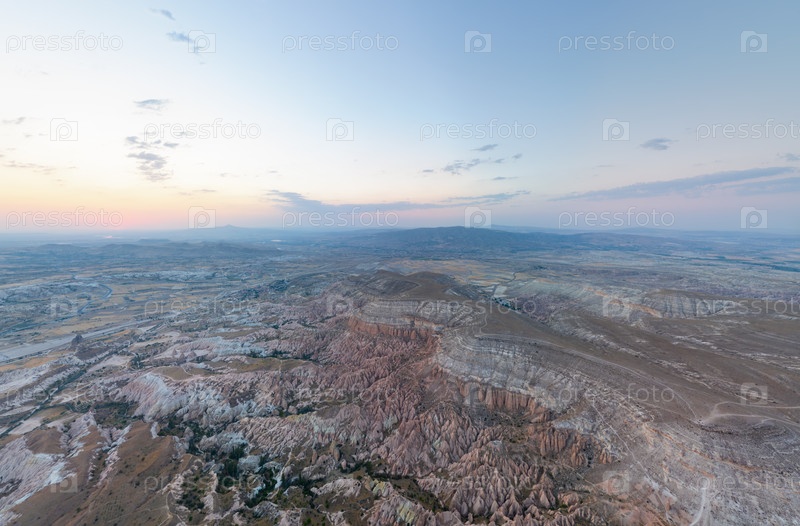 Гореме, Невшехир, Турция.Перспектива глубоко расчлененного вулканического плато Каппадокии, раскрывающая миллионы лет эрозионной истории через ее сложные системы долин и открытые пласты.Вид с воздуха