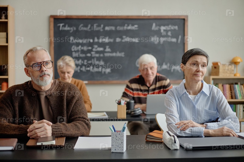 Кавказский мужчина и женщина слушают во время занятий по образованию для старших взрослых