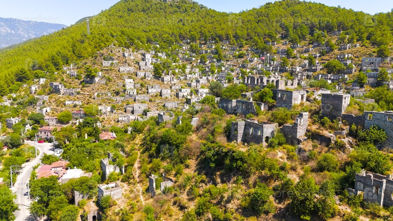 Каякой, Турция Вид с беспилотника на древние каменные руины в заброшенном городе-призраке на горном холме под ярким солнечным светом