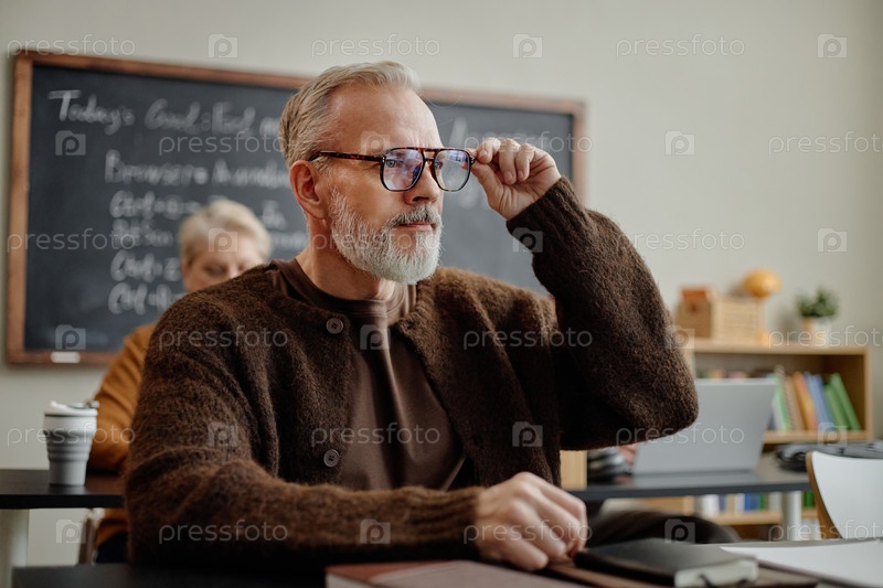 Кавказский мужчина средних лет посещает занятия и слушает во время урока