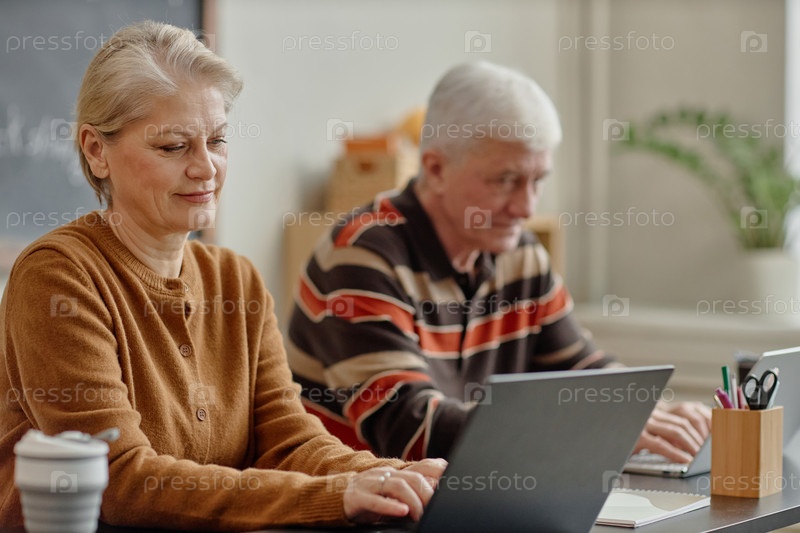 Кавказская женщина и мужчина старшего возраста используют ноутбуки во время учебы в классе