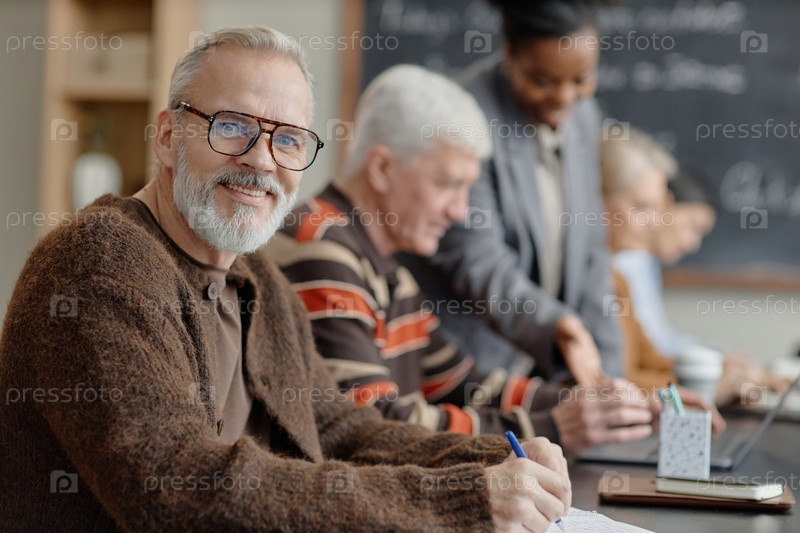 Портрет старшего белого мужчины, улыбающегося во время занятий по образованию взрослых