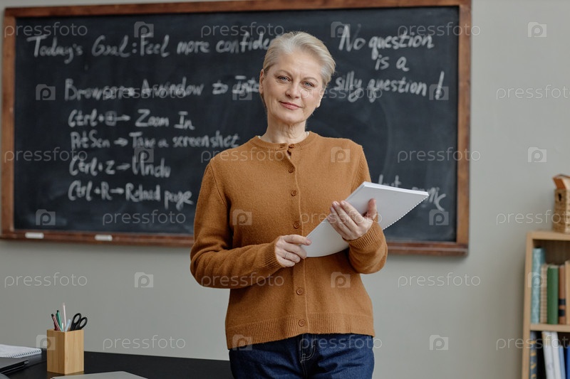 Портрет кавказской старшей учительницы, держащей блокнот в классной обстановке